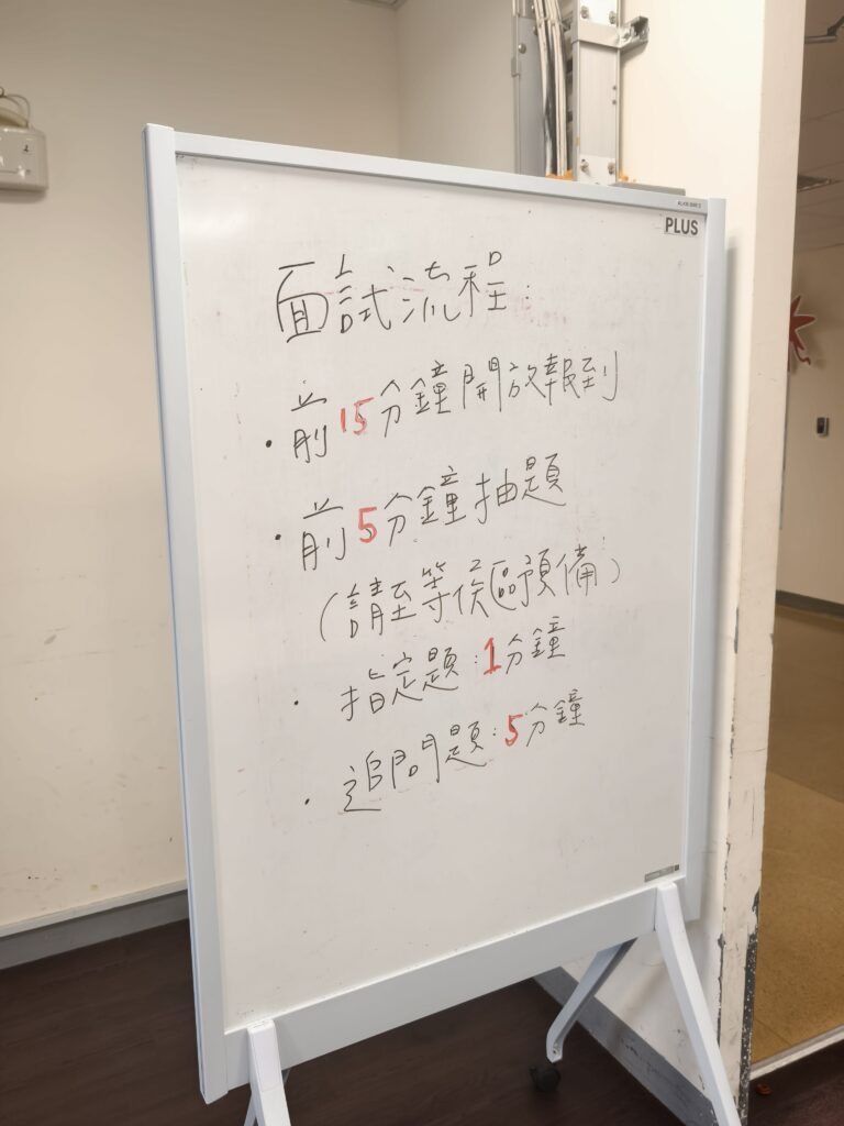 在傳完書審檔案後,如果書審通過會收到兩種信,一種是直接錄取的信,另一種是要面試的,而我本人是後者。 面試的問題主要聚焦在「團隊經驗」和「專案經驗」上。分兩間教室面試,也就是這兩個主題,照下面這個流程來問。