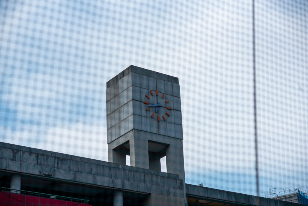 校舍最高處的時鐘蠻精緻的,但可惜時間是錯的,不過也有可能本就是個裝飾。 配合上校園圍牆邊的尼龍網,為照片蓋上了一層整齊劃一的網狀圖案。