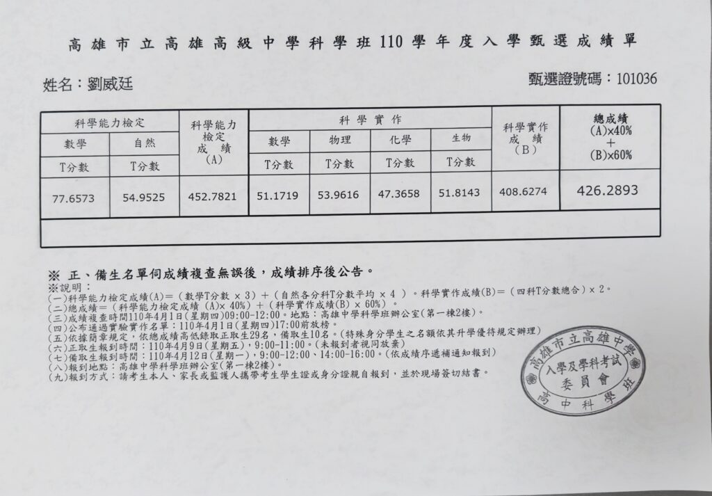 當年科學班的入學成績單