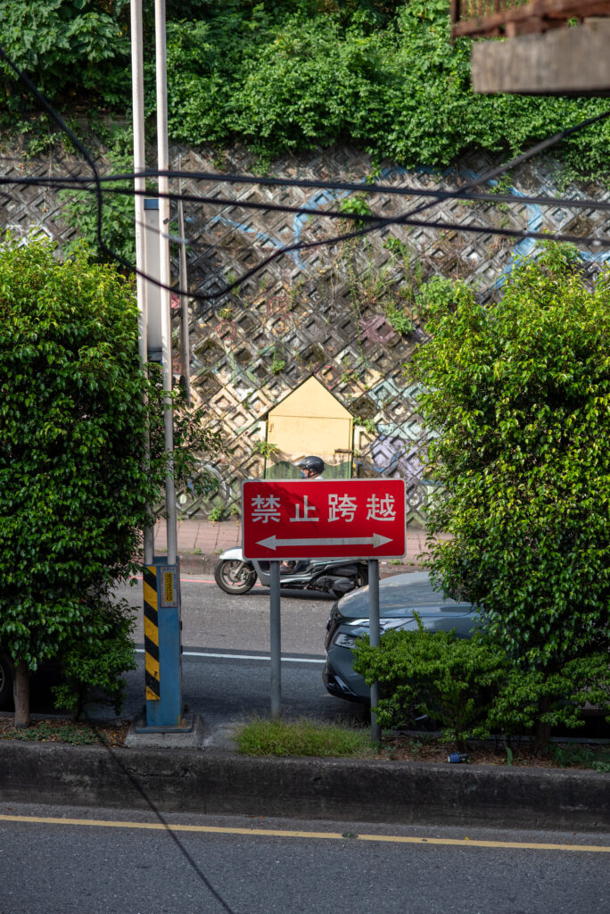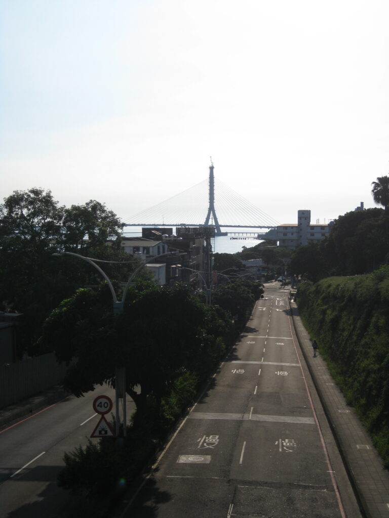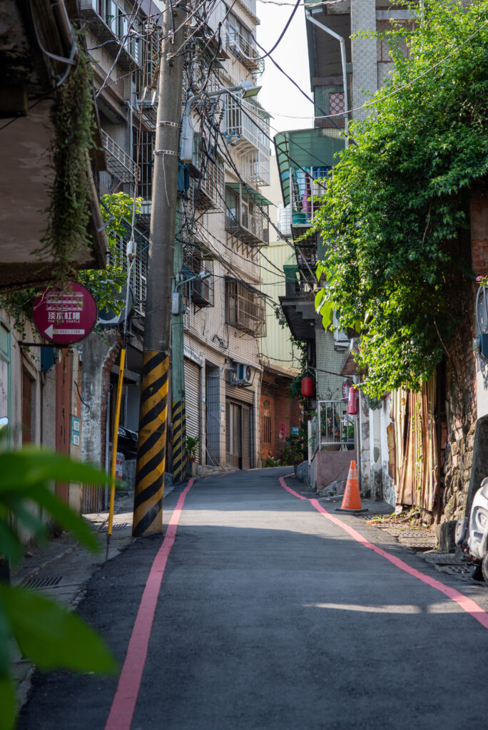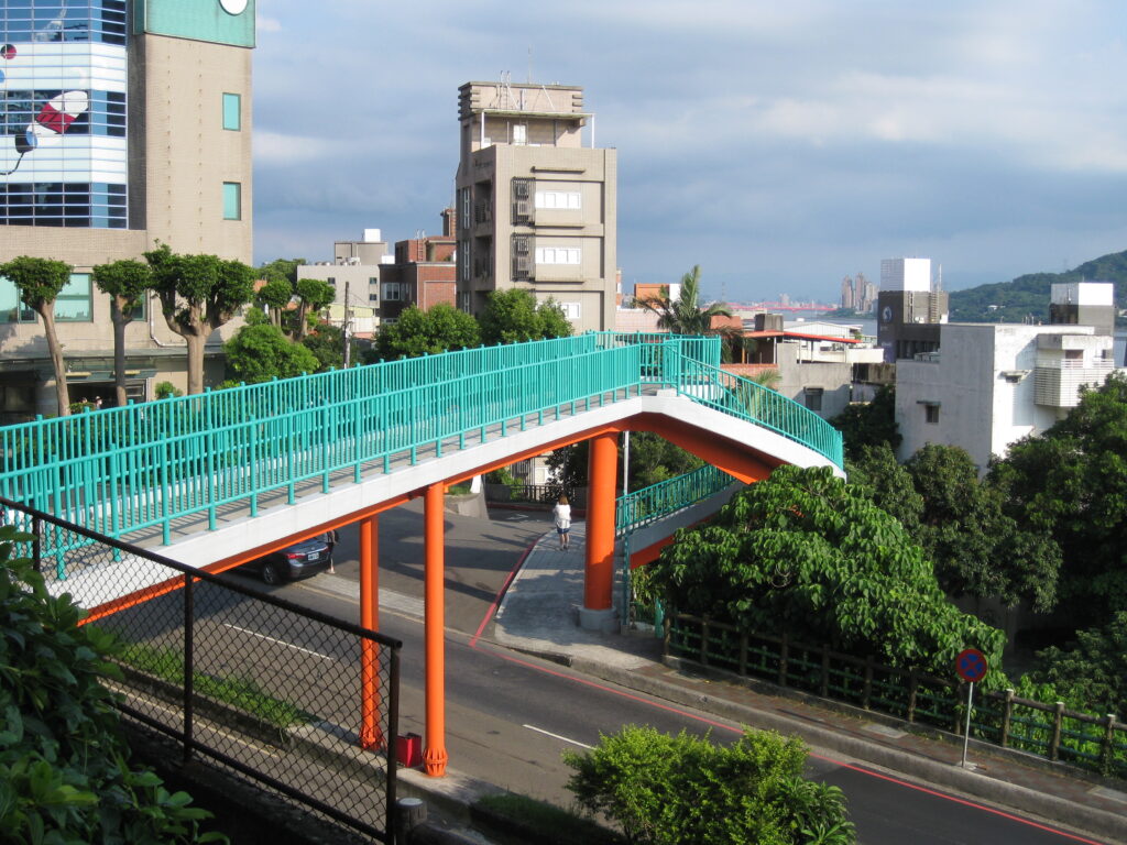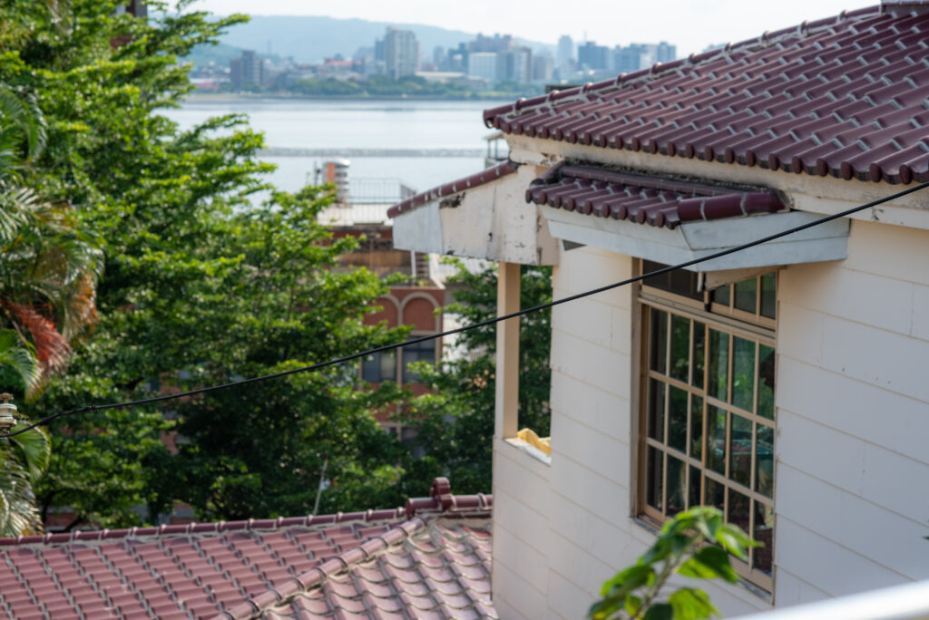沿著旁邊的小巷走去,高低的分界相當明顯,走在高處的邊緣,眺望著下方街道與建築,屋頂與遠方的八里共同構築出了諧和的畫面。