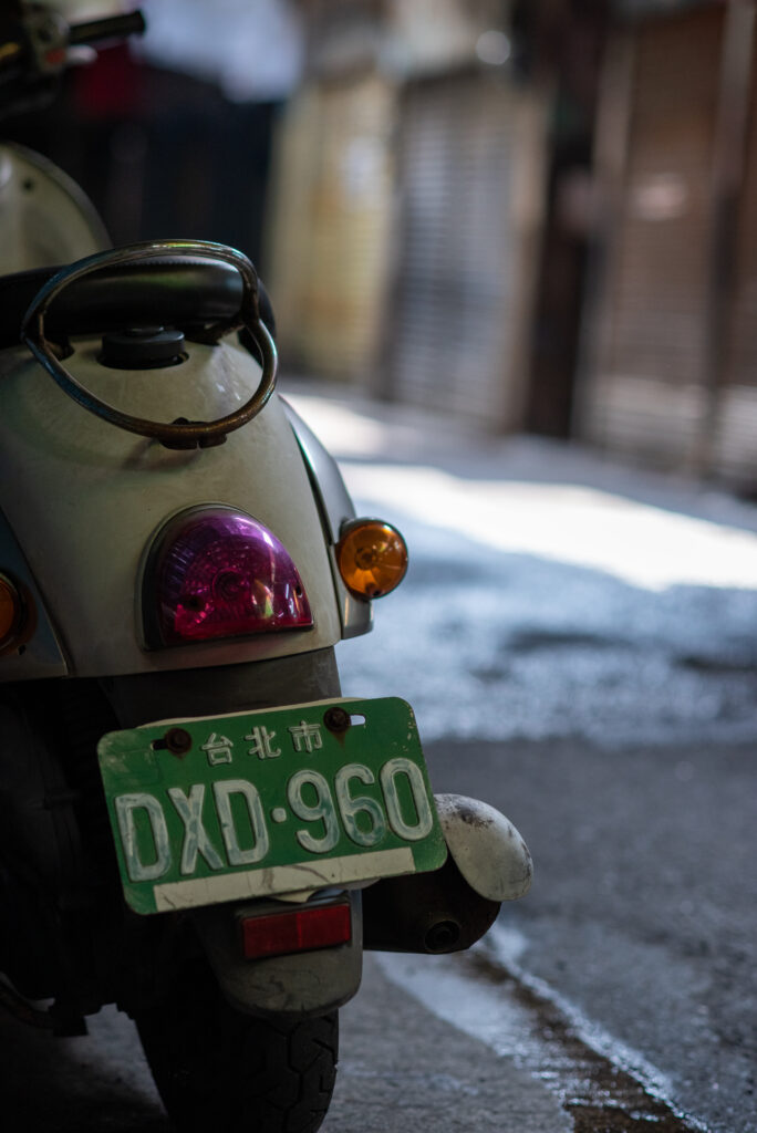 接著走過地下道來到老街這端,炎熱的天氣使人感到煩躁,相機背帶與皮膚間相互摩擦,更加劇了不適感,大約20分鐘後就習慣了。 走進一旁的小市場,看到略為老舊的摩托車停放在牆角,隨手將這份靜謐藉由相機給捕捉下來。
