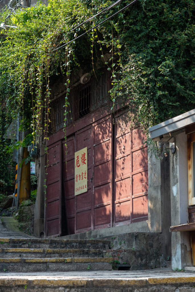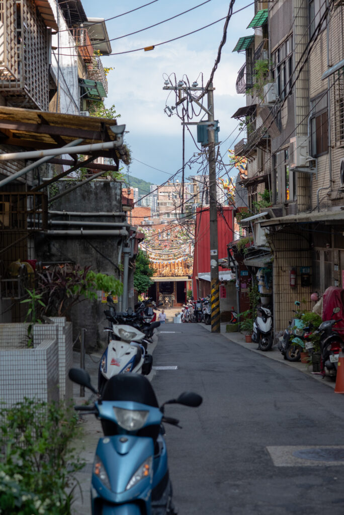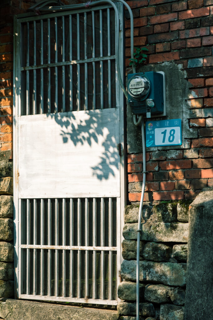 最後從另一個出口離開這個街區,福德宮靜靜的矗立於街道的末尾。 兩旁瘦長的建築自然的營造出收束的效果,焦點自然地向前望去。 環顧四週,此時陽光正好,金黃和煦的撒落在鐵門上,營造出了一道自然的層次。